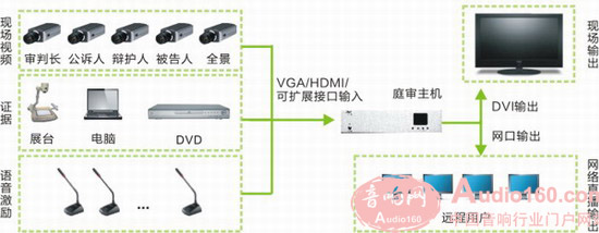 系統(tǒng)功能具體包括:設(shè)備自動(dòng)化控制、語音激勵(lì)自動(dòng)跟蹤攝像、證據(jù)展示、庭審過程聲音、筆錄及圖像錄制,實(shí)時(shí)后臺(tái)交互、庭審過程網(wǎng)絡(luò)現(xiàn)場(chǎng)直播、遠(yuǎn)程立案取證、電子檔案查詢、現(xiàn)場(chǎng)錄像服務(wù)器儲(chǔ)存功能等。