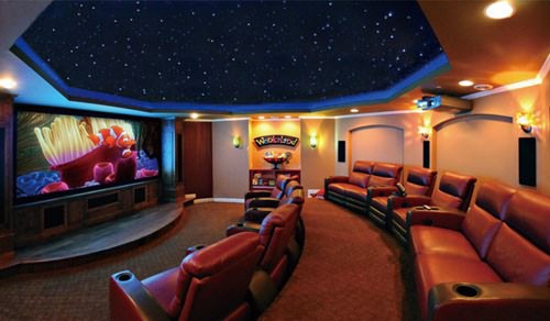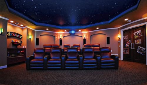 星空效果:整個房間以棕色、黃色為主色調(diào),天花板的星空位置則是加入了藍色LED燈光的點綴,配合一些安裝墻壁四周的裝飾品,這個視聽室顯得十分溫馨和舒適,給人難忘的觀影體驗