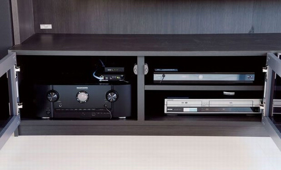 影音功放和播放設(shè)備巧妙的隱藏于電視柜中,平時(shí)關(guān)上整個(gè)空間整潔美觀。音響均采用普樂(lè)之聲的RC60i吸頂音箱五只,整個(gè)影音設(shè)備分為音頻和視頻兩大塊,主要有馬蘭仕AV功放SR6006、夏普LC-60L5液晶電視一臺(tái)、愛(ài)普生3D投影機(jī)一臺(tái)、夏普BD-WD1000播放機(jī)和普樂(lè)之聲吸頂音箱。