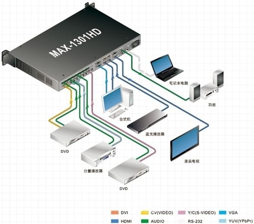 MAX-1301HD-B 擁有12路視頻信號(hào)輸入:2路CV,2路S-Video,2路分量視頻,2路VGA,4路HDMI/DVI。2路視頻信號(hào)輸出:1路HDMI,1路VGA。