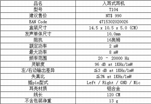 首先來看一下T104,這是一款重低音入耳式耳機。通常情況下,入耳式耳機不足的地方在于對低頻的控制上,處于封閉式的結(jié)構(gòu),因此當?shù)皖l量稍微充足一些時,殘響問題就會比較突出,而T104是專為低音燒友打造的重低音耳機,其突出特點就在于對低音效果的加強和優(yōu)化,其采用金屬耳殼,高低音分明,中音和諧細致,震撼低音,更具空間感立體環(huán)繞音效,音感立體分明,適合流行樂、搖滾樂,鼓聲清脆,可帶來置身音樂會現(xiàn)場般的震撼音效。