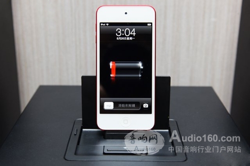 開啟電源后就可以放上擁有支援 Lightning 接頭的 Apple 行動裝置,不管有沒有播放音樂,都有支援裝置充電的功能,這次我使用的是 iPod Touch 進行試聽。