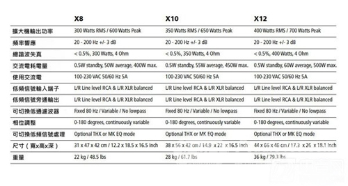 這是原廠技術(shù)白皮書里所公布的X系列三款超低音重要規(guī)格比較表,可以發(fā)現(xiàn)在音箱大小、重量、單體尺寸之外,最大的差異在于內(nèi)建擴(kuò)大機(jī)的輸出功率,一路由X8的300瓦RMS、X10的350瓦RMS到X12的400瓦RMS(峰值功率依序?yàn)?00瓦、650瓦及700瓦)。