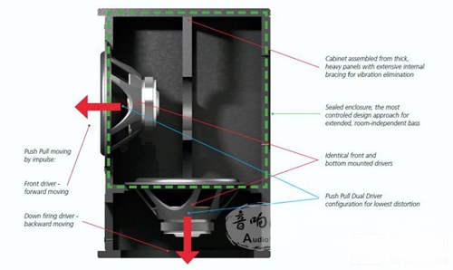 MK Sound超低音這兩支單體是以一正一反方式裝設(shè)的,并且位于底部的單體予以反相連接,因此兩支單體就會(huì)以相反的路徑動(dòng)作。當(dāng)安裝于正面的單體向內(nèi)縮時(shí),位于底部的單體也同時(shí)向內(nèi)動(dòng)作,此時(shí)兩單體所處密閉音箱內(nèi)的空氣就受到強(qiáng)力壓縮,有如「空氣彈簧」般迅速將兩支單體「推回原位」(當(dāng)正面單體向外推的時(shí)候也一樣),如此一來MK這種雙單體推挽設(shè)計(jì)就可大幅降低單體振膜的非線性失真,讓超低音的發(fā)聲更為精準(zhǔn)快速。