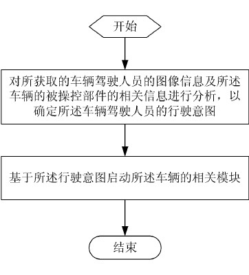 系統(tǒng)基于駕駛?cè)藛T的啟動(dòng)操作,通過分析模塊對(duì)所獲取的車輛駕駛?cè)藛T的圖像信息及車輛的被操控部件(包括:方向盤、檔位、油門、剎車中的一種或多種)的相關(guān)信息進(jìn)行分析,以確定所述車輛駕駛?cè)藛T的行駛意圖;在有效分析相關(guān)信息的基礎(chǔ)上,系統(tǒng)基于車輛駕駛?cè)藛T的行駛意圖,由啟動(dòng)模塊啟動(dòng)所述車輛的相關(guān)模塊。