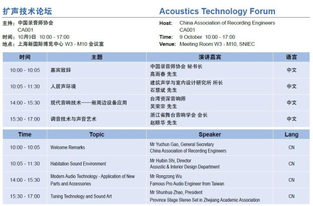 2014年10月9日,上海,新國際博覽中心,上海國際專業(yè)燈光音響展同期活動(dòng)之“擴(kuò)聲技術(shù)論壇”,我們將為您打開這扇嫁接靈感與理性的門,架起一座連接臺(tái)前與幕后的橋。論壇屆時(shí)將邀請(qǐng)到臺(tái)灣著名音響師吳榮宗先生和浙江省舞臺(tái)音響協(xié)會(huì)會(huì)長(zhǎng)趙順華先生座客,以深厚的理論基礎(chǔ)及豐富的案例分析,與大家共同就“現(xiàn)代音響技術(shù)——新周邊設(shè)備應(yīng)用”以及“調(diào)音技術(shù)與聲音藝術(shù)”等課題領(lǐng)域進(jìn)行交流與探討。