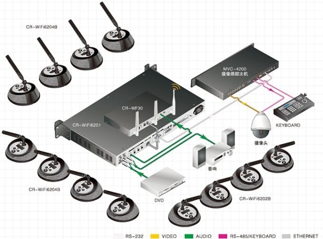 5G WiFi全數(shù)字無線會議系統(tǒng)是CREATOR快捷于2012年面向全球推出的國內(nèi)首創(chuàng)WiFi全數(shù)字無線會議系統(tǒng),該會議系統(tǒng)最大的優(yōu)勢在于采用了干擾少、信道多的5G WiFi頻道。由于WiFi信號無方向性傳輸、不受障礙物阻擋、傳輸距離遠(yuǎn)等特性,在整體方案的設(shè)計(jì)上,根據(jù)會場的實(shí)際使用面積,只需配置一臺無線接入點(diǎn)CR-WF30就可完成整個(gè)會場信號的覆蓋。會議主機(jī)CR-WiFi6201內(nèi)置自動攝像跟蹤控制功能,配合攝像跟蹤混合主機(jī)CR-MVC4200、高清視頻會議攝像機(jī)CR-V1013,可進(jìn)行全程自動跟蹤拍攝,高度符合廣東省農(nóng)業(yè)廳現(xiàn)代高科技會議要求。
