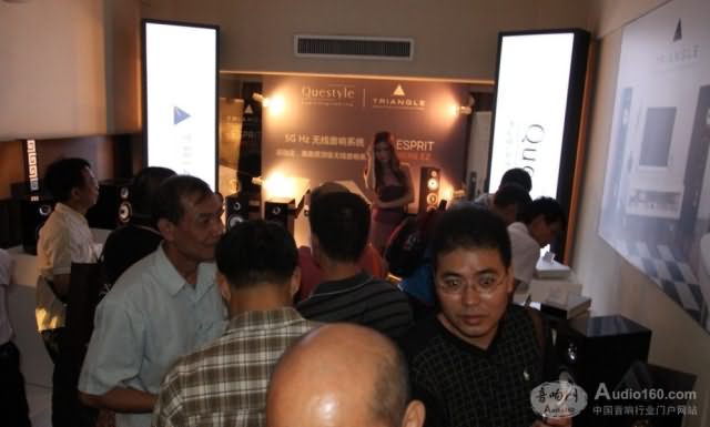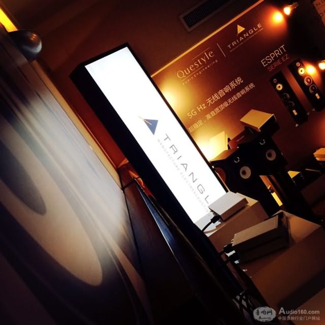 五樓展廳為5GHz無線音響系統(tǒng)的產(chǎn)品展示。法國三角音箱作為曠世音響的戰(zhàn)略合作伙伴,海外銷售總監(jiān)Rune從法國波爾多到廣州參與此次展會(huì)。這是三角音箱的最新產(chǎn)品EZ系列首次在中國展示,現(xiàn)場(chǎng)演示則運(yùn)用2對(duì)無線功放R200來驅(qū)動(dòng)一對(duì)落地箱。啞銀色噴砂功放搭配黑色鋼琴烤漆的音箱,加上兩邊帶有曠世,三角的LOGO燈箱,現(xiàn)場(chǎng)效果堪稱完美。開展首日,展廳內(nèi)一直人潮涌動(dòng),多次爆棚,吸引各路媒體爭(zhēng)相報(bào)道,拍照。