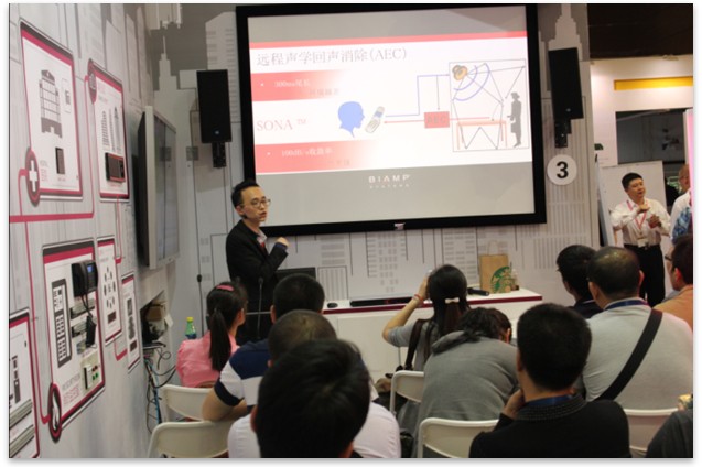 此次InfoComm China期間,天創(chuàng)中電攜手BIAMP Systems公司為廣大的專業(yè)人士帶來了多場關(guān)于DSP處理方面的精彩講座,眾多專業(yè)人士對最新的DSP處理技術(shù)表現(xiàn)出濃厚的興趣,積極關(guān)注并參與討論,現(xiàn)場氣氛火爆。除了對技術(shù)方面的講解,在展會期間,天創(chuàng)中電還云集全國各地的專業(yè)技術(shù)顧問和資深銷售專員,實(shí)時(shí)介紹并根據(jù)客戶的技術(shù)提問面對面的溝通交流,讓客戶可進(jìn)一步了解BIAMP的產(chǎn)品。