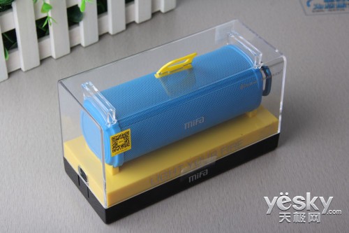 打開包裝之后,就可以拿到音箱了。在顏色方面,Mifa F5藍牙音箱共有4種顏色可選,我們收到的是藍色版。在造型方面,Mifa F5采用的長圓筒形設計,很有新意。表現(xiàn)采取了塑膠和金屬的保護,有戶外使用的感覺。