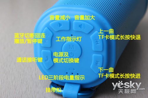 左側是機身的接口部分,掀開皮套,可以看到里面設計有一個Micro USB充電接口、AUX外接音源接口、TF卡插槽、RESET復位鍵。右側是倒U型排列的按鍵設計,因為這款藍牙音箱自帶了1200毫安的鋰電池,因此還有著電量顯示的指示燈。