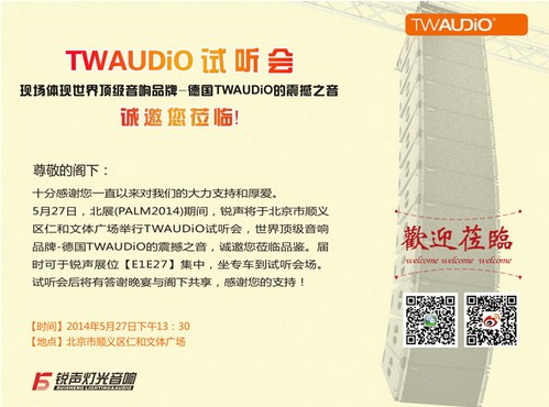 5月27日,北展(PALM2014)期間,銳聲將于北京市順義區(qū)仁和文體廣場舉行TWAUDiO試聽會,世界頂級音響品牌-德國TWAUDiO的震撼之音,誠邀您蒞臨品鑒。屆時(shí)可于銳聲展位【E1E27】集中,坐專車到試聽會場,試聽會后還將舉行答謝晚宴。