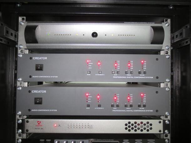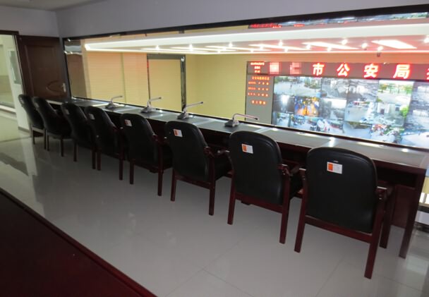 該指揮中心研判室與處警室運用了CREATOR快捷數(shù)字化有線會議系統(tǒng)的核心部分——會議系統(tǒng)控制主機(jī)CR-M4101及桌面式純發(fā)言主席/代表單元CR-CR-M4102/04B,采用32bit高速浮點、DSP處理技術(shù),可配合電話耦合器,可以進(jìn)行遠(yuǎn)程電話會議;配合攝像跟蹤系統(tǒng)(如該會議室安裝的吸頂式球形攝像機(jī))可實現(xiàn)攝像自動跟蹤;提供帶寬20Hz~20KHz完美音質(zhì)。