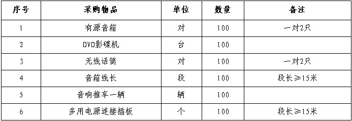采購(gòu)音響設(shè)備100套,采購(gòu)預(yù)算為30萬(wàn)元。技術(shù)要求、結(jié)構(gòu)、外型等具體詳見(jiàn)采購(gòu)文件。安裝地點(diǎn):縉云縣文化廣電新聞出版局指定的地點(diǎn)(全縣各鄉(xiāng)鎮(zhèn))。