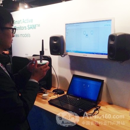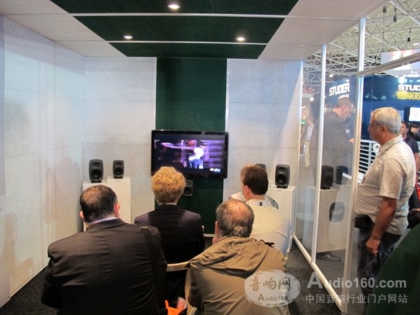 每一年的真力展位都少不了“耳聽為實”的聽音室,今年也是一樣。這次的聽音室有兩面半開放的玻璃墻,其余墻面采用了簡單的吸聲處理。音箱系統(tǒng)使用GLM的自動校準優(yōu)化功能進行了房間補償。