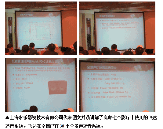 隨后,上海永樂影視技術(shù)有限公司代表分享了“飛達音響還音系統(tǒng)在永樂影院中的應用”,對高郵的全景聲影廳做了詳細的介紹和講解,介紹了建聲設(shè)計以及影院中使用的飛達產(chǎn)品。