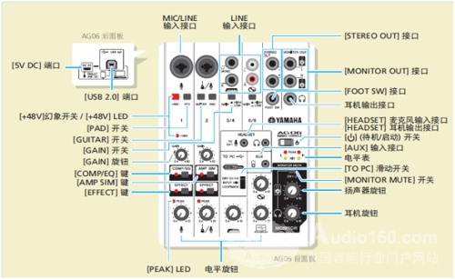 看起來好復(fù)雜?就拿尺寸相似的雅馬哈MG06調(diào)音臺相比,AG系列調(diào)音臺已經(jīng)相當?shù)暮啙嵙恕]關(guān)系,下面有專門的功能介紹,教你怎樣才能出聲音哦。