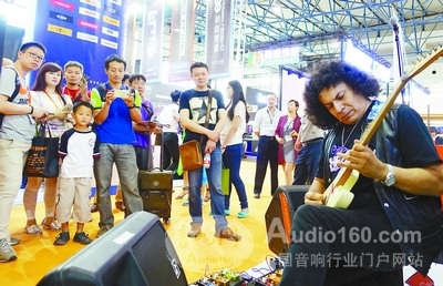 圖為來自美國阿諾瑪的演奏家為觀眾演示電吉他音響效果。