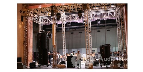 胡:視聽會26號下午2點正式開始,我們24號晚上就將設備運進場,25號早上搭設桁架,下午開始安裝和調試。主擴系統(tǒng)采用立體聲配置,我們在舞臺左右兩側各吊掛一個由6只Anya模塊構成的陣列,每個Anya陣列下面堆疊3只Otto模塊,提供更多的低音支持。