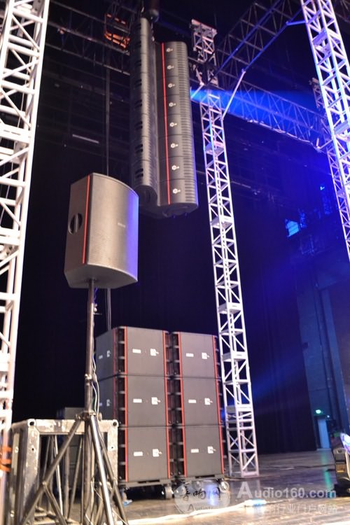 胡:視聽(tīng)會(huì)28號(hào)下午2點(diǎn)正式開(kāi)始,我們27號(hào)進(jìn)場(chǎng)開(kāi)始安裝和調(diào)試。主擴(kuò)系統(tǒng)采用立體聲配置,我們?cè)谖枧_(tái)左右兩側(cè)各吊掛一個(gè)由8只Anya模塊構(gòu)成的陣列,每個(gè)Anya陣列下面堆疊6只Otto模塊,提供更多的低音支持。其實(shí),前期的建模顯示,6只Anya模塊+3只Otto模塊的配置已完全夠用,前區(qū)的聲壓級(jí)可達(dá)到121 dB,最后一排聲壓級(jí)為116 dB。不過(guò),為了給來(lái)賓呈現(xiàn)最好的效果,我們采用了8+6的配置。 舞臺(tái)一側(cè)8只Anya搭配地面堆疊的6只Otto