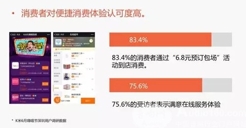 K米6月嗨唱節(jié)中所提出的“6.8元在線預(yù)訂活動(dòng)”與“在線超市支付隨機(jī)立減”活動(dòng),就是為擁有互聯(lián)網(wǎng)式消費(fèi)習(xí)慣的年輕人量身定做的。據(jù)統(tǒng)計(jì),K米6月嗨唱節(jié)期間,83.4%的消費(fèi)者通過在線預(yù)訂活動(dòng)到店消費(fèi),有75.6%的受訪者對(duì)通過手機(jī)操作的K歌體驗(yàn)表示滿意。