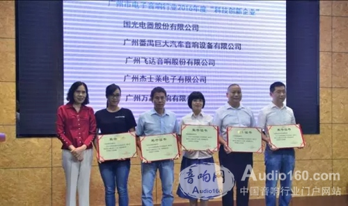 副會長單位、廣州番禺巨大汽車音響設(shè)備有限公司李富濤常務(wù)副總經(jīng)理和廣州飛達音響股份有限公司王本銀副總經(jīng)理為廣州市電子音響行業(yè)2016度“行業(yè)之星”頒發(fā)榮譽證書,Audiocenter奧雷(美女)代翁德祥經(jīng)理上臺領(lǐng)獎。