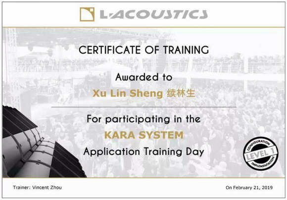 經(jīng)過本次培訓(xùn)實(shí)操后,學(xué)員均表示獲益良多,且對(duì)L-Acoustics有更深層次的認(rèn)知。培訓(xùn)結(jié)束,學(xué)員們獲得了由L-Acoustics頒發(fā)的培訓(xùn)證書。