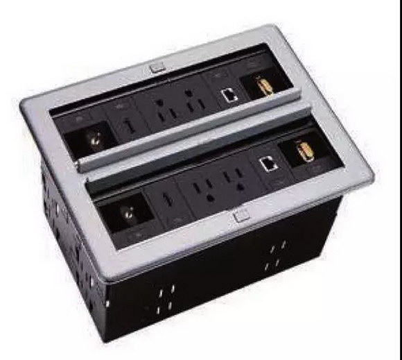 Crestron還推出了FT2 FlipTops,據(jù)稱它幾乎適用于任何標準斷面,可以齊平地安裝在表面上。只需按一下FT2 FlipTop上的按鈕即可打開并隱藏面板,整個過程都是靜音的。所有接頭和電纜此時都展現(xiàn)在桌面上,以便對各種設(shè)備進行供電、充電和連接。在配件方面,從回收器到國際電源模塊一應(yīng)俱全。