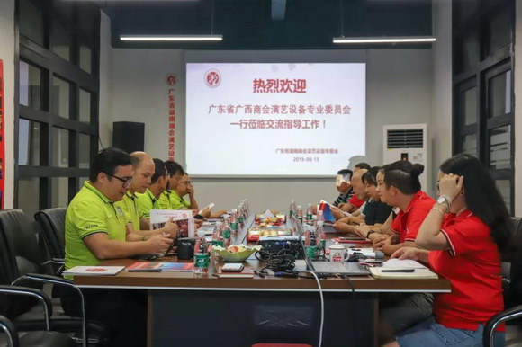 2019年8月15日下午,廣東省廣西商會(huì)演藝設(shè)備專業(yè)委員會(huì)一行蒞臨我會(huì)交流并指導(dǎo)工作。我會(huì)會(huì)長(zhǎng)張向農(nóng)率領(lǐng)理事會(huì)成員對(duì)此次來訪友會(huì)代表進(jìn)行熱情接待,雙方開展愉快的座談并交流學(xué)習(xí)。廣西商會(huì):戴小明會(huì)長(zhǎng),夏成輝執(zhí)行會(huì)長(zhǎng),曹金滿常務(wù)副會(huì)長(zhǎng),楊業(yè)鵬常務(wù)副會(huì)長(zhǎng),黃嘉華副會(huì)長(zhǎng),覃雪福副會(huì)長(zhǎng),黃顯強(qiáng)秘書長(zhǎng),冼東勝副秘書長(zhǎng),以及我會(huì):張向農(nóng)會(huì)長(zhǎng),廖紅義常務(wù)副會(huì)長(zhǎng),劉海玲常務(wù)副會(huì)長(zhǎng),王求德常務(wù)副會(huì)長(zhǎng),劉敏燕秘書長(zhǎng),孫思副秘書長(zhǎng),閆麗副秘書長(zhǎng),黃芳副秘書長(zhǎng)等人員參加此次交流指導(dǎo)工作。