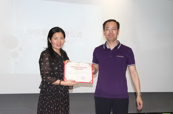 廣州市番禺區(qū)市場(chǎng)監(jiān)督管理局標(biāo)準(zhǔn)化科馬榮鑫宣讀了《廣東省市場(chǎng)監(jiān)督管理局關(guān)于同意成立第二屆廣東省音頻設(shè)備與系統(tǒng)標(biāo)準(zhǔn)化技術(shù)委員會(huì)的批復(fù)》“粵市監(jiān)處字[2019]50號(hào)”文件。廣州市番禺區(qū)市場(chǎng)監(jiān)督管理局標(biāo)準(zhǔn)化科科長(zhǎng)陳彬?yàn)樾乱粚玫膶<椅瘑T頒發(fā)聘書(shū)。