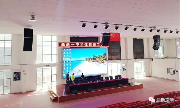 高唐一中多功能體育館主擴(kuò)聲設(shè)計(jì)選用了20只DESFINE迪斯DS98線陣列系列產(chǎn)品,其中18只雙8寸主擴(kuò)全頻線陣列音箱DS9828, 2只單18寸超低頻線陣列音箱DS9828S,分左中右三組采用專業(yè)的吊架固定安裝于位舞臺(tái)前沿,其中左右兩組主擴(kuò)聲音箱采用6只全頻DS9828音箱搭配1只DS9828S超低頻,中置采用6只全頻DS9828音箱,覆蓋整個(gè)觀眾區(qū)以及場(chǎng)地,達(dá)到滿足的擴(kuò)聲需求。