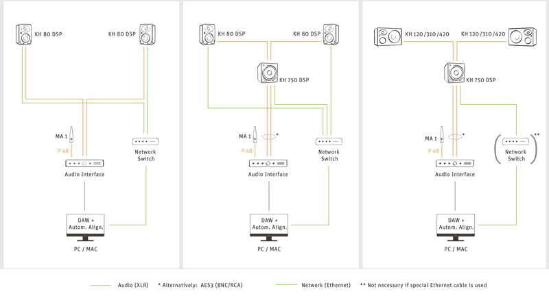 KH 80 DSP立體聲音箱可以直接通過軟件來控制。KH系列其它不帶DSP功能的揚聲器,在連接到KH 750 DSP低音音箱的模擬輸出后,也可以通過MA 1校準。因此,KH 120、KH 310和KH 420監(jiān)聽音箱的用戶不僅能享受到擴展的低音響應、完成房間校正,還能實現(xiàn)模擬揚聲器的線性相位響應。這一點也是目前獨一無二的。