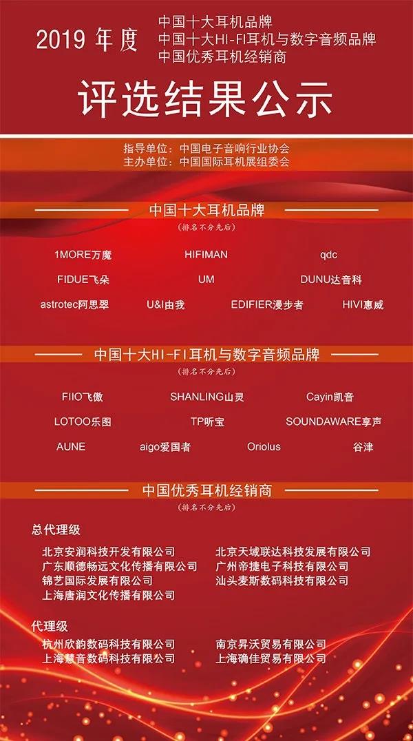 「中國十大耳機品牌」是由中國電子音響行業(yè)協(xié)會和中國國際耳機展組委會聯(lián)合舉辦的評選活動。評選結果由網(wǎng)絡投票、搜索熱度、營銷情況、產(chǎn)品獲獎以及企業(yè)規(guī)模、產(chǎn)值、專利數(shù)量等項目綜合計算得分,是音頻音響行業(yè)內最具分量的榮譽獎項之一。