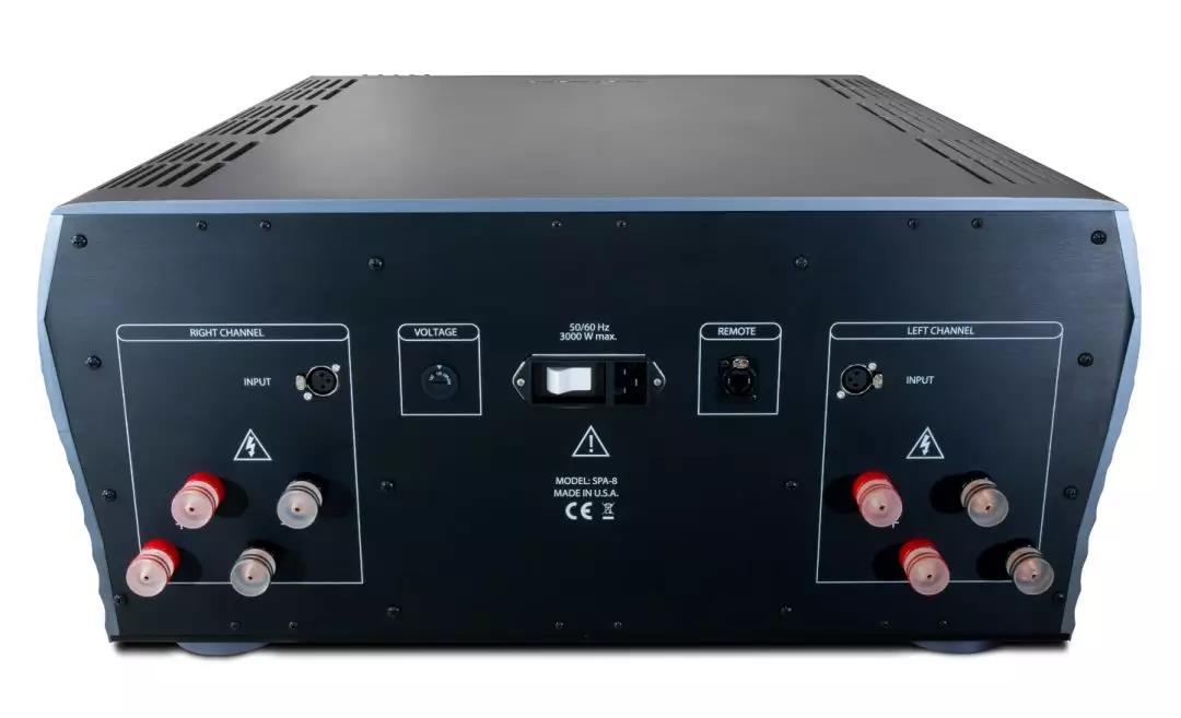 輸入環(huán)節(jié),SPA-8采用了超低噪聲差分線性相位輸入,組成獨立的互補差分純甲類輸入級。電壓放大級方面也是獨立互補方式,并且是純甲類放大。同樣是純甲類設(shè)計的還有前置驅(qū)動級及驅(qū)動級。輸出級方面,則是工作于甲乙類,雙極型設(shè)計,每個聲道使用了20只輸出功率200W的BJ放大晶體管,每聲道電流峰值輸出達到150A。在關(guān)鍵的電源環(huán)節(jié),采用了兩只容量1800VA的環(huán)形變壓器,均帶有電磁屏蔽罩,電解電容總?cè)萘窟_到294000μF,為整機提供充足而穩(wěn)定的電流。此外,每個聲道由一只獨立芯片對整個放大系統(tǒng)監(jiān)控,采用最新的溫度監(jiān)控技術(shù),以實現(xiàn)超快速且精準的偏壓控制。