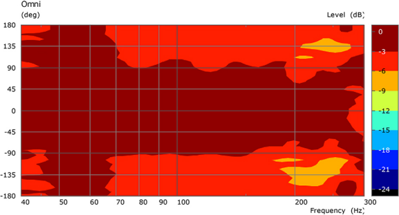 圖示:對兩個間隔4米,面向相同方向,相同EQ設(shè)定的低頻揚聲器進(jìn)行測試,圖中的X軸顯示的是頻率,Y軸顯示了輻射角度(0表示在軸上)同時信號的能量大小由不同顏色代表。