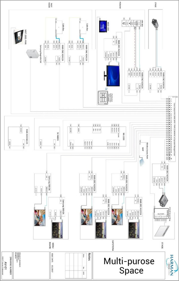 針對 K12 教育信息化的建設(shè),從特定教育場景的視聽需求出發(fā),現(xiàn)分享哈曼專業(yè)解決方案 Demo 的系統(tǒng)圖,展示可定制化的一站式音頻、視頻、控制與照明解決方案。