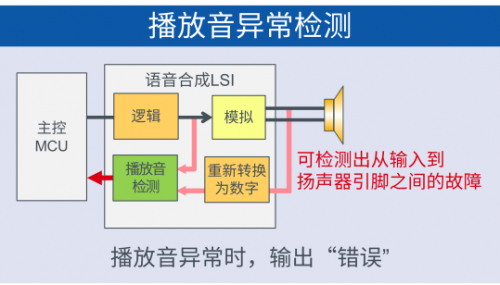 “ML2253x系列”新產(chǎn)品中新配置了播放音異常檢測功能。該功能會將揚聲器輸出的模擬信號重新轉(zhuǎn)換為數(shù)字信號,并將其與LSI內(nèi)部的播放數(shù)據(jù)進行比較,當檢測到高于設(shè)置值的異常情況時,會將錯誤信號反饋至主控MCU,這非常有助于提高語音輸出系統(tǒng)的品質(zhì)。