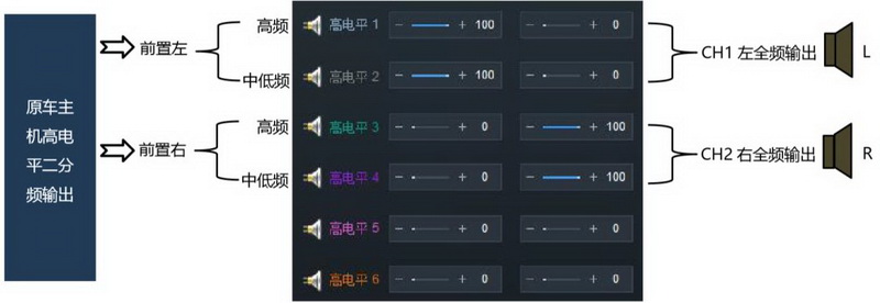原車主機高電平主動三分頻混音輸入,立體聲全頻輸出