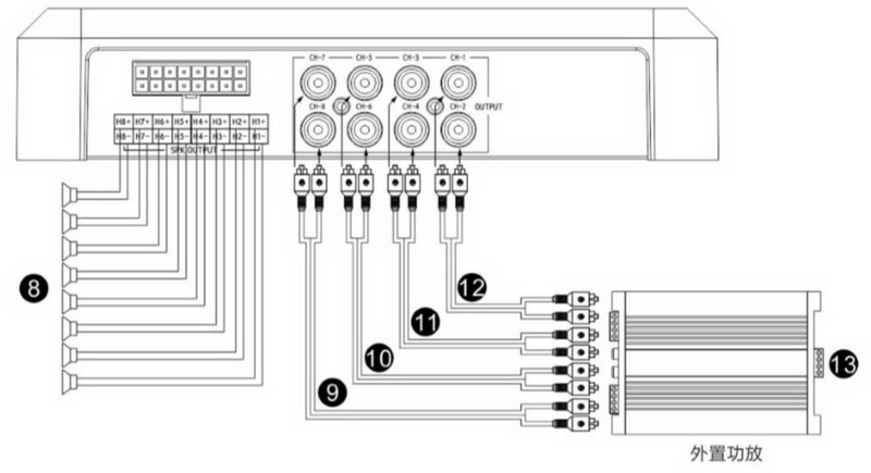 加上8通道RCA音頻信號輸出可以讓系統(tǒng)得到更大的擴展,比如替換更好的揚聲器以及超低音的補充。給車主提供了更多的升級空間。