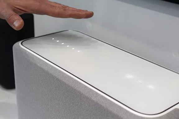天龍Home系列音響搭載了一個(gè)感應(yīng)式觸摸控制界面。它的特殊之處在于,只有當(dāng)你把手放在音響上方時(shí),在近距離傳感器感應(yīng)到之后,才會(huì)觸發(fā)控制界面顯示。