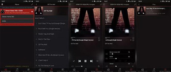 Deezer在Heos應(yīng)用上的播放界面,可以訪問音響(左側(cè)截屏)、播放列表中的歌曲、當(dāng)前播放的歌曲(中間兩個(gè)截屏)以及關(guān)于當(dāng)前歌曲的信息和快捷菜單提供的選項(xiàng)(右側(cè)截屏)。
