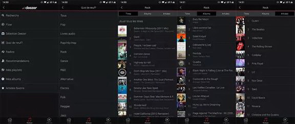 Heos應(yīng)用中的Deezer界面在“新發(fā)布”選項(xiàng)提供了新近發(fā)布音樂的推薦,并按照音樂類型、歌曲名稱、專輯和歌手進(jìn)行分類。