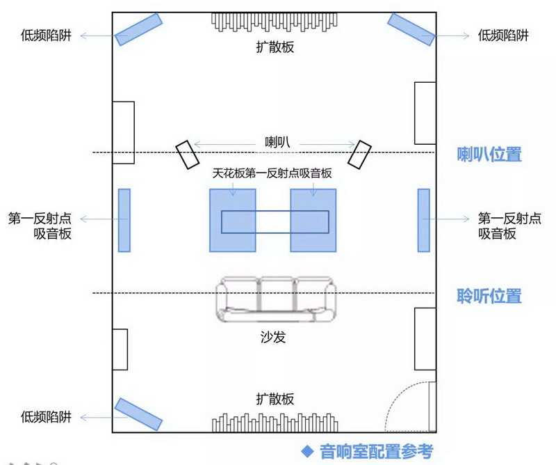 4. 兩側(cè)墻壁與天花板, 地板的第一反射點(diǎn)做吸音處理.