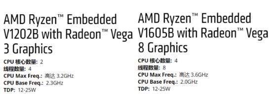作為AMD重啟嵌入式方案的開山之作,R1000系列主打入門級嵌入式市場,V1000系列則面向中高端嵌入式方案。杰和DM6性能由低到高選用了AMD V1000系列的 V1202B和 V1605B兩款CPU,分別擁有雙核四線程和四核八線程,基礎(chǔ)主頻分別為2.3GHz和2.0GHz。