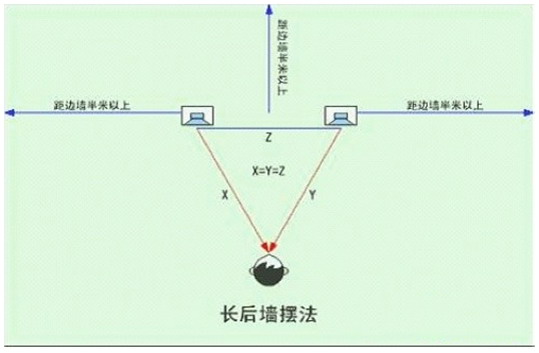 從圖示以及說明的擺法中就不難看出這種擺法更加適合房間細(xì)長的用戶,側(cè)墻之間的距離較窄的話使用這種方法往往能得到相比其他方法更加優(yōu)秀的聲音,并且這個擺法對于房價本身的布局要求也比較低。