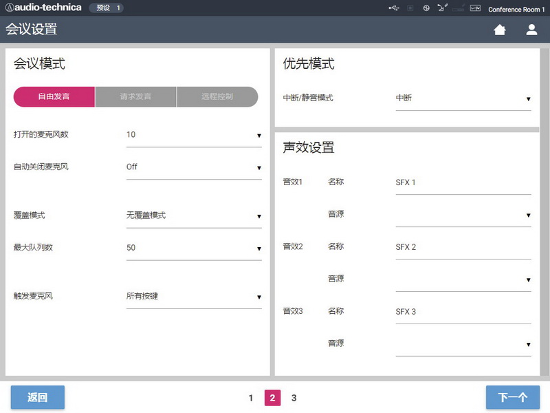 (Web Remote)控制,進行會議控制、會議話筒底座設置網(wǎng)絡設置、音頻設置以及對會議進行實時管理。