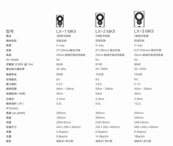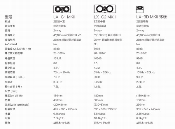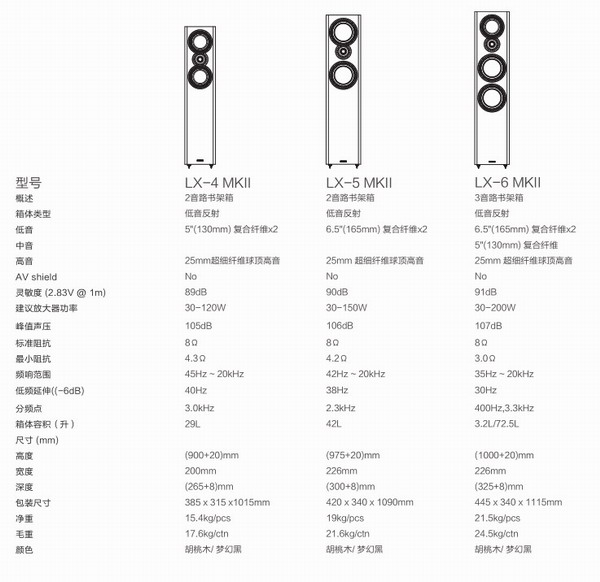 全新的LX-MKII系列提供了豪華黑色和經(jīng)典的胡桃木色,LX MKII系列包括九個型號:三款書箱(LX-1 MKII,LX-2MKII,LX-3 MKII),三款落地箱(LX-4 MKII,LX-5 MKII,LX-6 MKII),兩款中置(LX-C1 MKII,LX-C2 MKII)和一個3D環(huán)繞揚(yáng)聲器(LX-3D MKII環(huán)繞)。