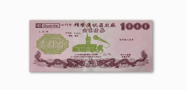 然而,施強的大膽創(chuàng)新不僅體現(xiàn)在營銷方面,由于當時辦廠資金極其困難,施強乃敢為人先地在恩平發(fā)行了第一套企業(yè)債券。施強回憶:“很早的時候我就在恩平發(fā)行過幾次企業(yè)債券了,之前都沒有人這么做過。由于我在金融機構(gòu)的誠信較好,而他們也覺得精藝的發(fā)展勢頭好,所以很樂意幫助我們解決資金難題。債券是以江門市精藝通訊器材廠的名義,我本人負責簽名發(fā)行的。所有人都可以購買,年利息比銀行稍高。因為精藝的口碑和信譽較好,大家也都信得過我,債券在一天內(nèi)就被搶購光了”。