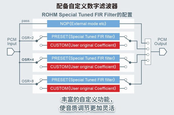 “BD34301EKV”可以從“預(yù)設(shè)/自定義/外設(shè)”中選擇會(huì)影響音質(zhì)的數(shù)字信號(hào)處理電路的數(shù)字濾波器(FIR濾波器)。濾波器的計(jì)算系數(shù)和過(guò)采樣率也可以通過(guò)編程功能進(jìn)行自定義。利用這些特色,客戶可以構(gòu)建自己的數(shù)字濾波器,并輕松地為不同的音響設(shè)備實(shí)現(xiàn)不同的音質(zhì)調(diào)整,這將非常有助于減少客戶開(kāi)發(fā)工時(shí)并實(shí)現(xiàn)制造商所追求的理想音質(zhì)效果。