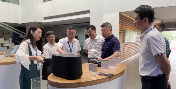 梁招權(quán)副處長等人在國光電器總裁辦主任劉喬仿的陪同下,參觀了國光電器的消音室、產(chǎn)品展廳等,并體驗了國光電器產(chǎn)品的效果。